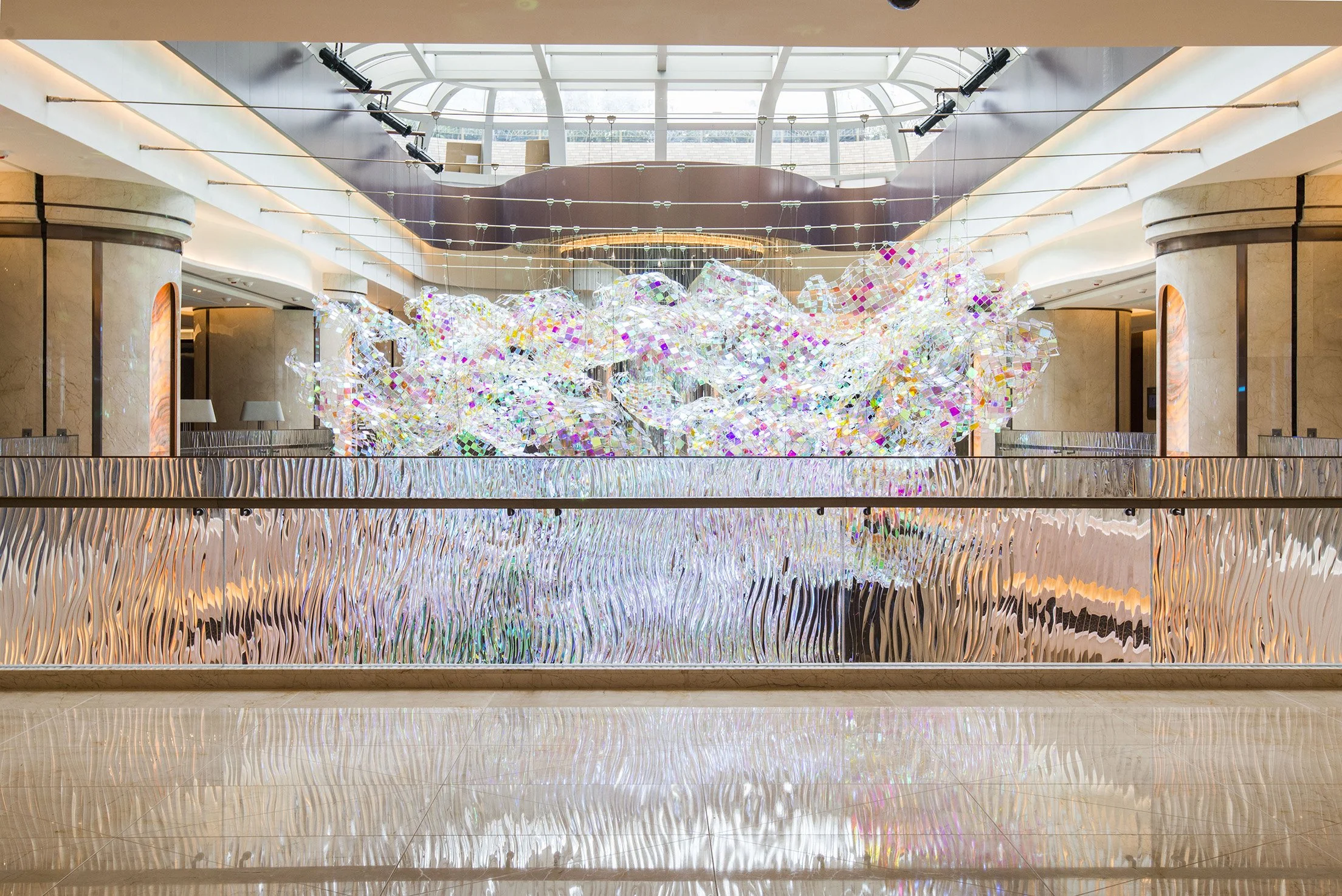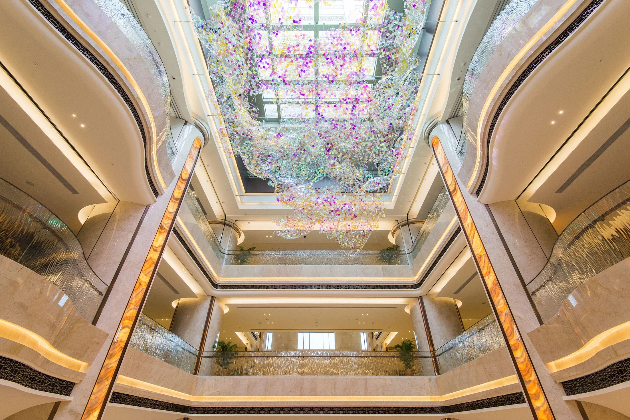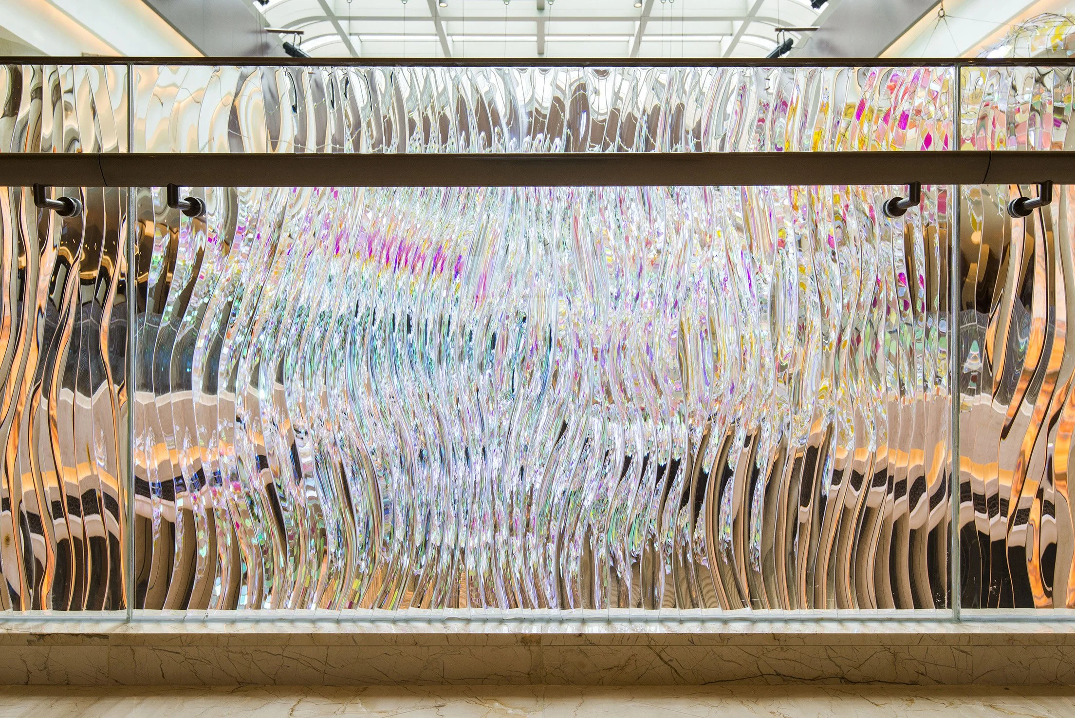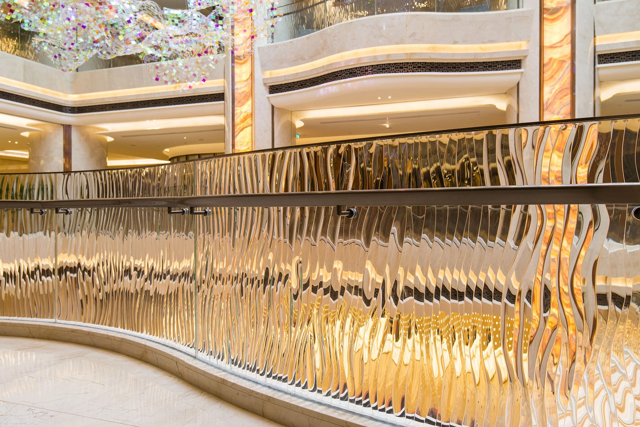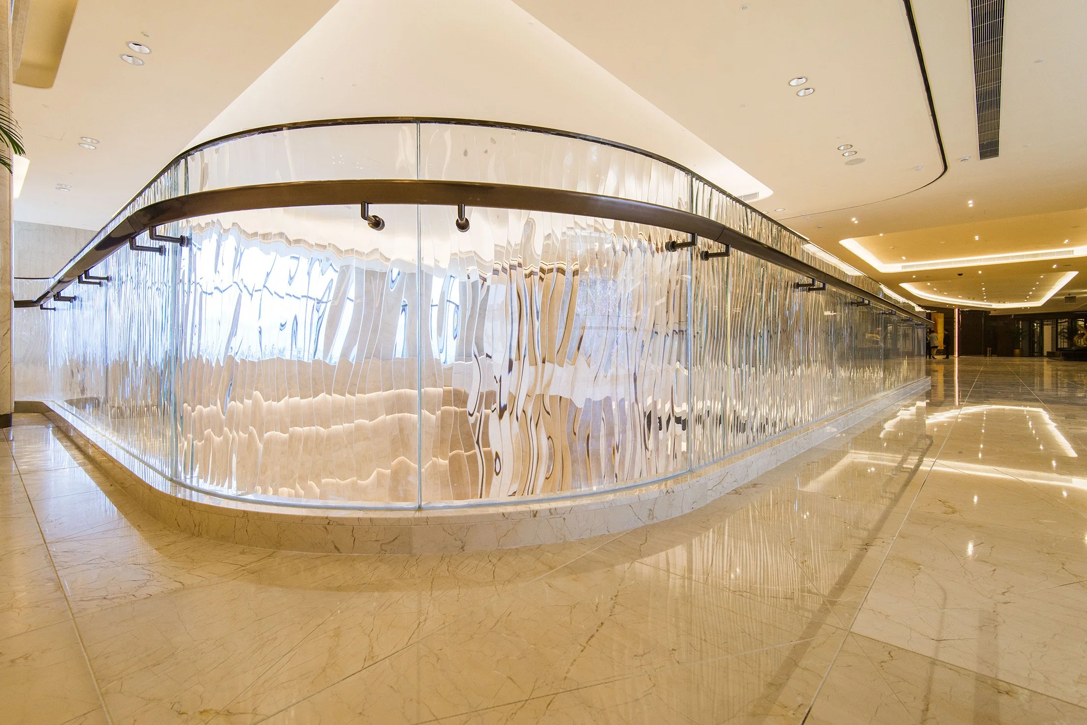 The entrance of the JW Marriott Hotel Galaxy features custom InfiniT Glass that highlight the venue's sophisticated design. Curved 3D glass has been expertly used to create elegant railings and extends gracefully to the stairs, showcasing advanced technical know-how. This hotel project demonstrates the seamless integration of innovative building materials with high-end interior solutions, reflecting both aesthetic appeal and functional precision.